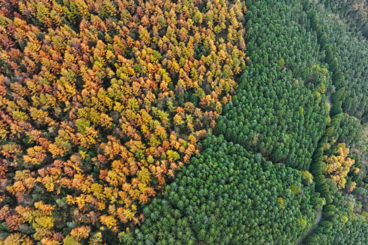 初冬,黔江国家森林公园灰千梁子景区迎来了最迷人的季节。森林里一侧落叶松金黄灿烂,一侧柳杉翠绿如初,两种颜色相接,呈现出“平分秋色”的美丽景观(无人机照片),吸引了众多游客前往打卡、游玩。
