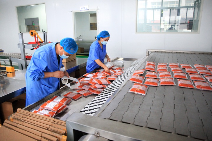 8月12日,工人在黔江区高新区一食品公司智能化生产车间包装鲜菜火锅食材。近年来,黔江区借势成渝地区双城经济圈建设,依托高新区,聚力发展食品及农产品加工业。目前,全区拥有鲜菜火锅食材、牛肉脯、鸡杂等食品及农产品加工企业86家,产业集群渐成规模,为区域经济打造四百亿级产值新引擎增添强劲动力。