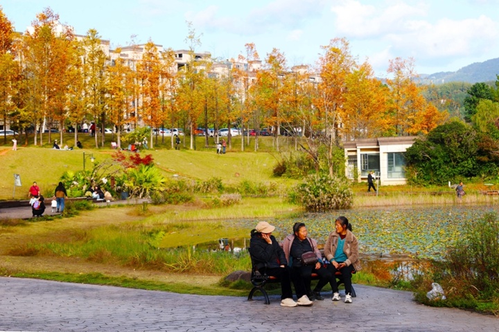 初冬时节,“口袋公园”的水杉、梧桐、银杏等树叶五彩斑斓,吸引了不少市民前往打卡、游玩。